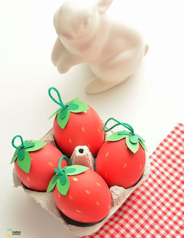 Βάψτε τα αυγά σας κόκκινα όπως πάντα, χωρίς όμως να τα αφήσετε πολύ ώρα στη βαφή και πάρουν πολύ σκούρο χρώμα. Στη συνέχεια, με ένα ανεξίτηλο χρυσαφί μαρκαδοράκι σχεδιάστε τα σποράκια της κάθε «φράουλας». Στην κορυφή, μπορείτε να κόψετε και να κολλήσετε φυλλαράκια από χαρτόνι χειροτεχνίας.