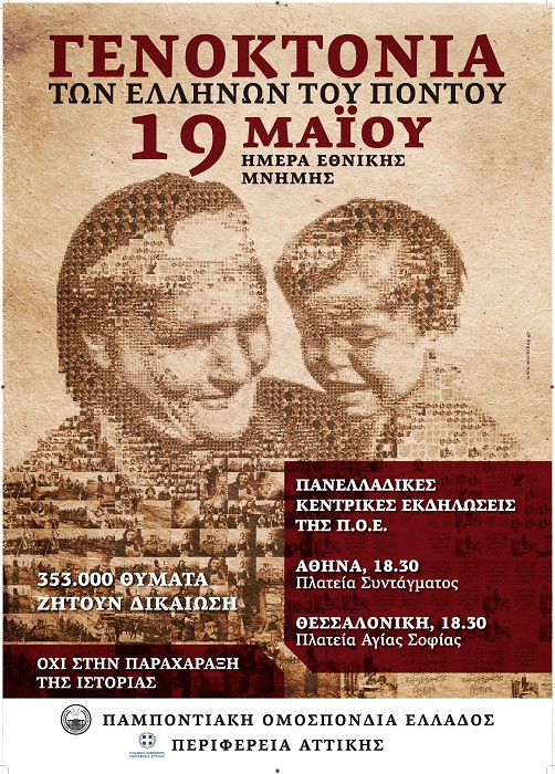 ► Την Κυριακή 21 Μαΐου στην πλατεία Αλεξάνδρας στον Πειραιά θα πραγματοποιηθούν τα αποκαλυπτήρια του μνημείου Γενοκτονίας. Στις 11:30 άφιξη λιτανευτικής πομπής Ιεράς εικόνας Παναγίας Σουμελά στην πλατεία Αλεξάνδρας. Θα ακολουθήσει επιμνημόσυνη δέηση στα θύματα της Γενοκτονίας των Ποντίων. Στις 12:00 ο πρόεδρος της Διεθνούς Συνομοσπονδίας Ποντίων Ελλήνων, Γιώργος Παρχαρίδης, θα κάνει ιστορική αναφορά στη Γενοκτονία των Ποντίων. Στις 12:15 θα πραγματοποιηθεί τελετή αποκαλυπτηρίων μνημείου Γενοκτονίας. Πυρρίχιος χορός από τον ΣΠΟΣ Νότιας Ελλάδας και Νήσων της ΠΟΕ και κατάθεση στεφάνων.