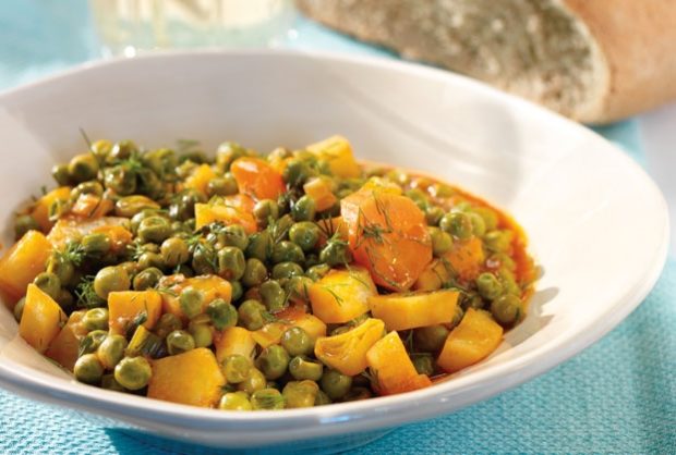 Ρίχνουμε τον αρακά στην κατσαρόλα, ρίχνουμε τον μισό άνηθο, τον μισό δυόσμο και ανακατεύουμε.
