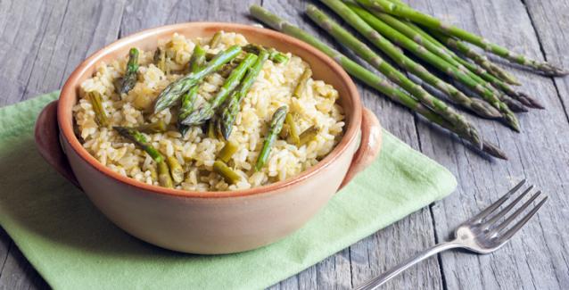 Βράζετε το ρύζι για 10 λεπτά και στη συνέχεια κόβετε το 1/3 περίπου από το σκληρό κοτσάνι των σπαραγγιών και τα βράζετε 7 λεπτά μέχρι να μαλακώσουν.