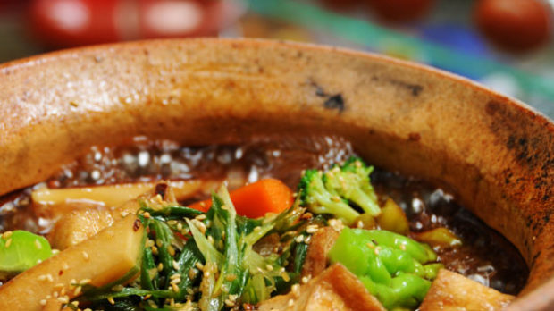 Λαχανικά σε πήλινο σκεύος με κάλυμα
