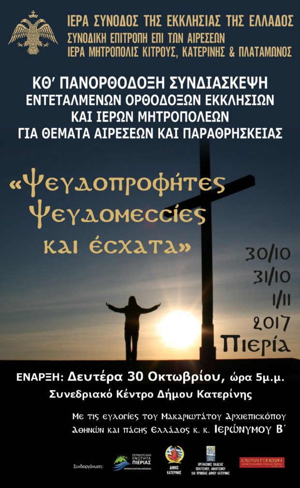 Κατόπιν πρωτοβουλίας του Σεβασμιωτάτου Μητροπολίτη Κίτρους, Κατερίνης και Πλαταμώνος κ. Γεωργίου και ύστερα από απόφαση της Ιεράς Συνόδου της Εκκλησίας της Ελλάδος, πραγματοποιείται στην Πιερία, από 30 Οκτωβρίου έως και 1 Νοεμβρίου, η παραπάνω εκκλησιαστική Συνδιάσκεψη υπό την αιγίδα του Μακαριωτάτου Αρχιεπισκόπου Αθηνών και Πάσης Ελλάδος κ.κ. Ιερωνύμου Β’. Το γενικό της θέμα είναι: «Ψευδοπροφήτες-Ψευδομεσ