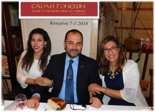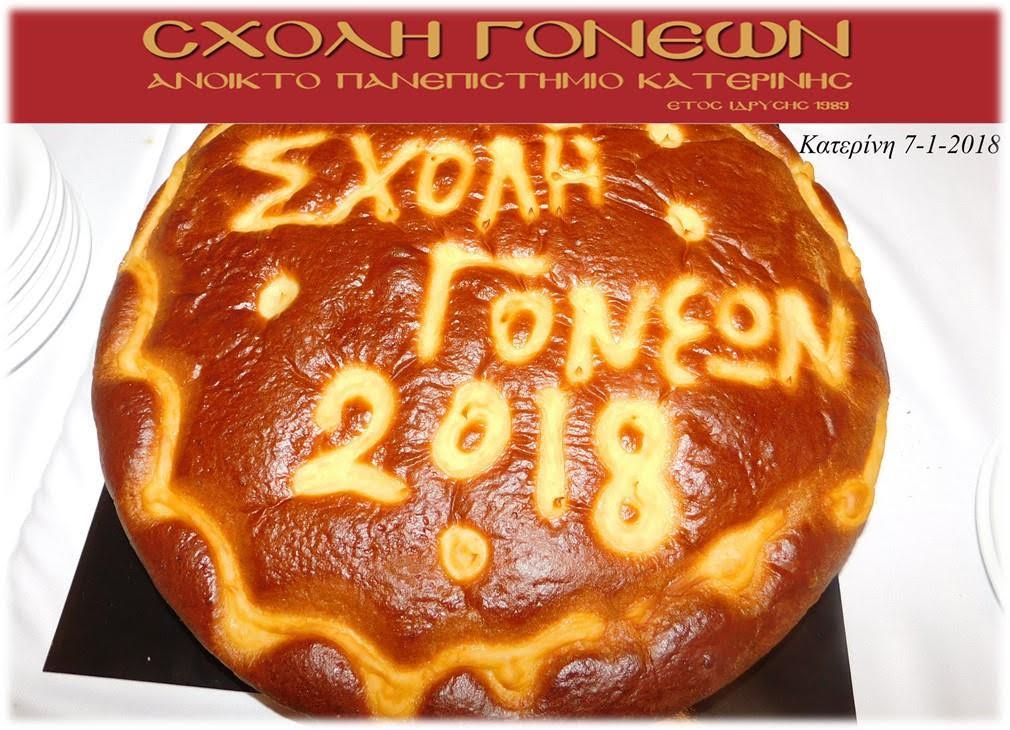 Πραγματοποιήθηκε την Κυριακή 7 Ιανουαρίου 2018 η καθιερωμένη κοπή της Βασιλόπιτας των μελών του Δ.Σ. της Σχολής Γονέων – Ανοικτού Πανεπιστημίου Κατερίνης σε ένα ευχάριστο και εορταστικό κλίμα στο Εστιατόριο «Απόλαυση».