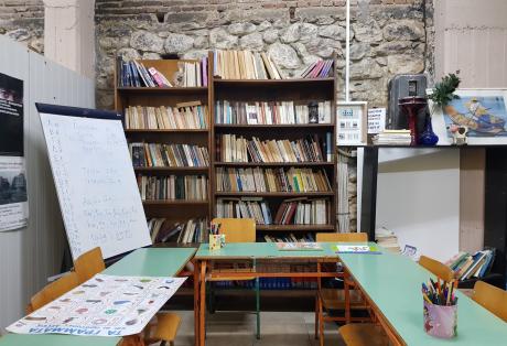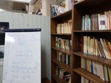 Λίγα θρανία, αρκετά βιβλία -από την Ά Δημοτικού κιόλας- έντυπα με συστήματα εκμάθησης της ελληνικής γλώσσας χωρίς ενδιάμεσσο διερμηνέα και άλλα υλικά και μέθοδοι επιστρατεύονται στην Ιωάννου Βλάχου, σε έναν μικρό αλλά αρκετό χώρο για τις ανάγκες εκείνων που θέλουν να μάθουν.
