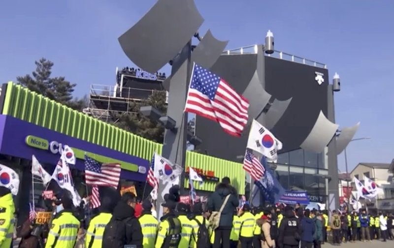 In this grab taken from TV, protesters hold flags as they demonstrate outside the Olympic Stadium in Pyeongchang, South Korea, Friday, Feb. 9, 2018. Around 50 people protested on Friday against North Korea’s participation in the Winter Olympics, ahead of the opening ceremony for the Games in Pyeongchang. (AP Photo)