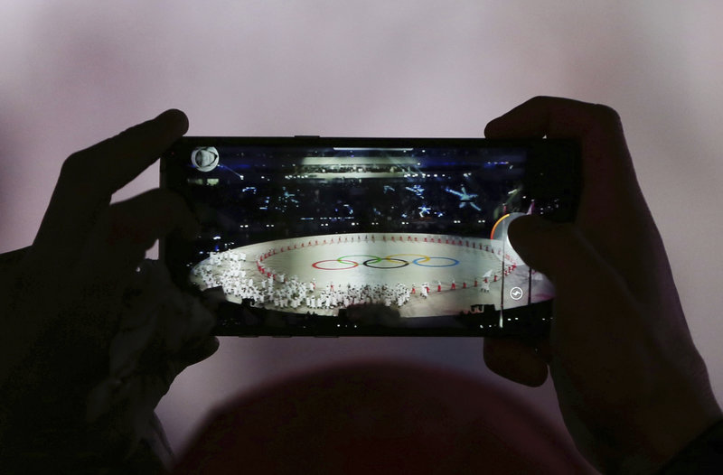 A spectator takes a picture of the opening ceremony of the 2018 Winter Olympics in Pyeongchang, South Korea, Friday, Feb. 9, 2018. (AP Photo/Natacha Pisarenko)