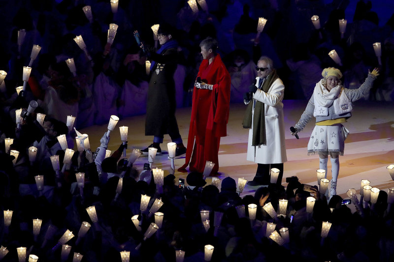 From left; Singers Ha Hyun-woo, Lee Eun-mi, Jeon In-kwon and An Ji-yeong perform during the opening ceremony of the 2018 Winter Olympics in Pyeongchang, South Korea, Friday, Feb. 9, 2018. (Sean Haffey/Pool Photo via AP)