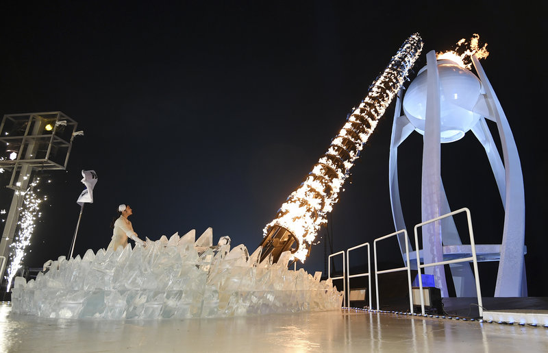 South Korean Olympic figure skating champion Yuna Kim lights the Olympic flame during the opening ceremony of the 2018 Winter Olympics in Pyeongchang, South Korea, Friday, Feb. 9, 2018. (Franck Fife/Pool Photo via AP)