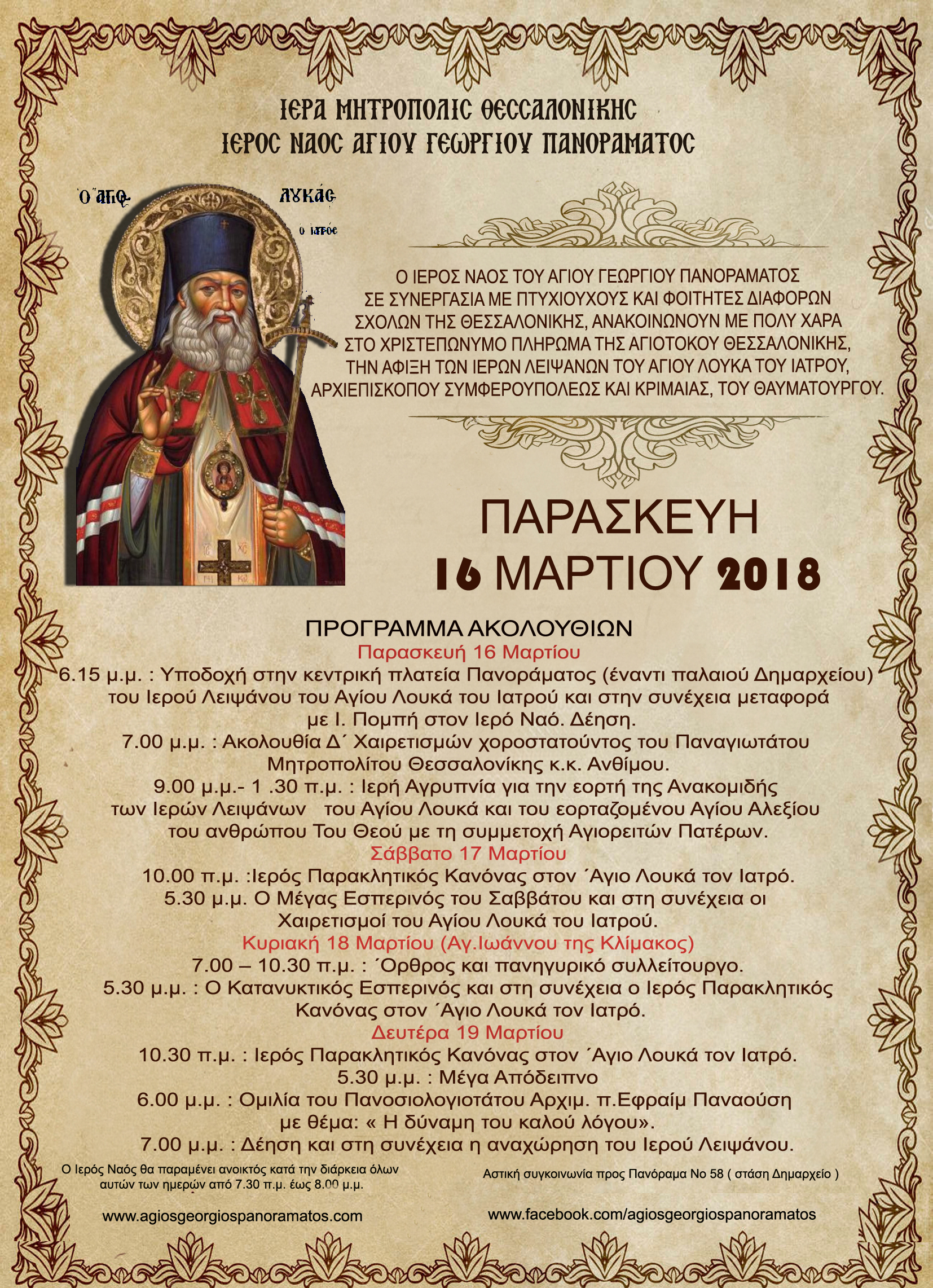 Έλευση των Ιερών Λειψάνων του Αγίου Λουκά του Ιατρού, Αρχιεπισκόπου Συμφερουπόλεως και Κριμαίας του Θαυματουργού, στον Άγιο Γεώργιο Πανοράματος Θεσσαλονίκης, θα πραγματοποιηθεί την Παρασκευή 16 Μαρτίου.