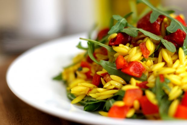 Σαλάτα κριθαράκι με σαφράν και σκορδάτα ψητά ντοματίνια