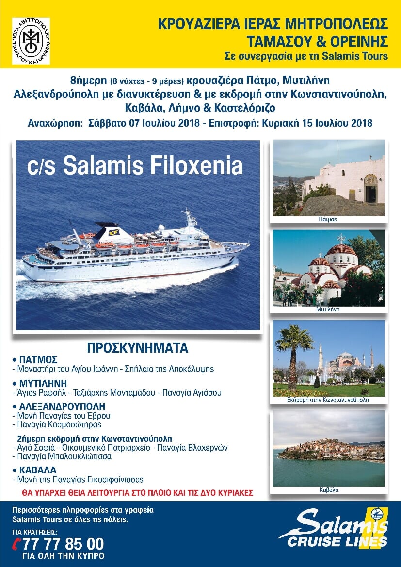 Η Ιερά Μητρόπολις Ταμασού και Ορεινής διοργανώνει από τις 7 μέχρι τις 15 Ιουλίου 2018, οκταήμερη προσκυνηματική κρουαζιέρα στην Πάτμο, Μυτιλήνη (στον Άγιο Ραφαήλ και Αρχάγγελο Μιχαήλ Μανταμάδου), στην Αλεξανδρούπολη (με διήμερη εκδρομή στην Κωνσταντινούπολη), στην Καβάλα, στη Λήμνο και στο Καστελλόριζο.