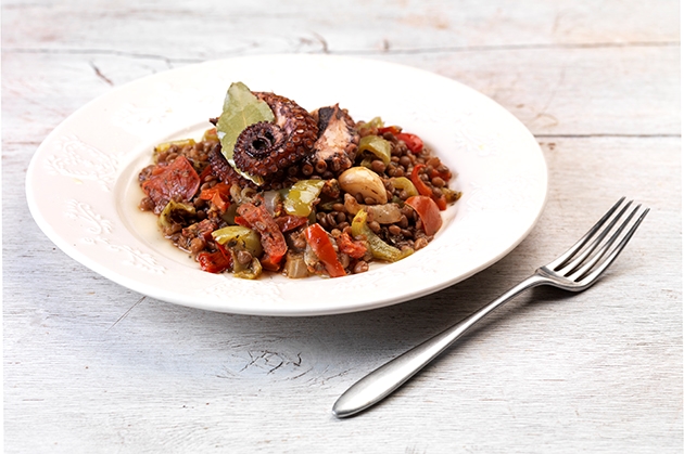 Φακές με χταπόδι και λαχανικά στη γάστρα