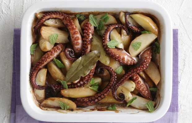Αν και φουρνιστό το χταπόδι, το μαγείρεμα ξεκινά από την κατσαρόλα, για να βγάλει σε εύλογο διάστημα τα υγρά του.