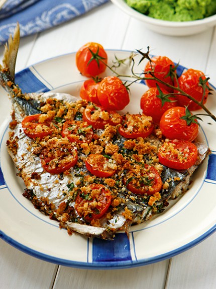 Κολιοί στο φούρνο με ντοματίνια και πουρέ αρακά