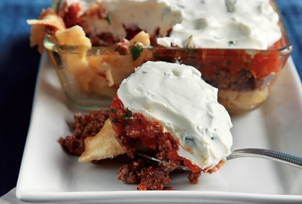 Ανακατεύουμε σε μπολ το γιαούρτι, το δυόσμο και λίγο αλάτι. Σε πυρίμαχο σκεύος στρώνουμε τις πίτες σε μία στρώση. Περιχύνουμε με το σοταρισμένο κιμά. Περιχύνουμε με την πυκνή σάλτσα ντομάτας. Τέλος, απλώνουμε σε μία στρώση το γιαούρτι. Ψήνουμε το φαγητό στο φούρνο για 15΄ στους 200oC.