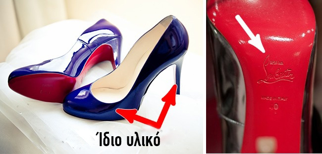 Η σόλα και τα πέλματα. Η σόλα είναι πάντα κόκκινη και το χρώμα είναι φωτεινό, καθαρό και ομοιόμορφο παντού. Υπάρχουν στάμπες που αναγράφουν το «Christian Louboutin», το «Made in Italy» και το μέγεθος. Μερικές φορές, τα δερμάτινα μοντέλα έχουν το πρόσθετο «Vero Cuoio». Η γραφή «Christian Louboutin» είναι ανάγλυφη και δεν επιτρέπονται άλλες στάμπες ή γράμματα.