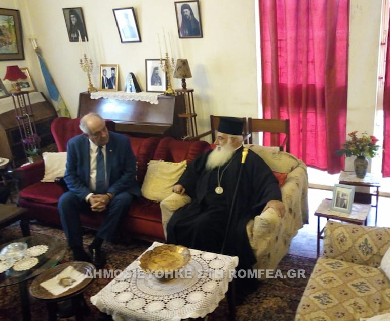Ο Σεβασμιώτατος χάρισε στον κ. Υφυπουργό μια εξαίρετης τέχνης εικόνα της Παναγίας και ο κ. Υφυπουργός έδωσε στον Σεβασμιώτατο ένα αρχαίο αντίγραφο δίσκου.