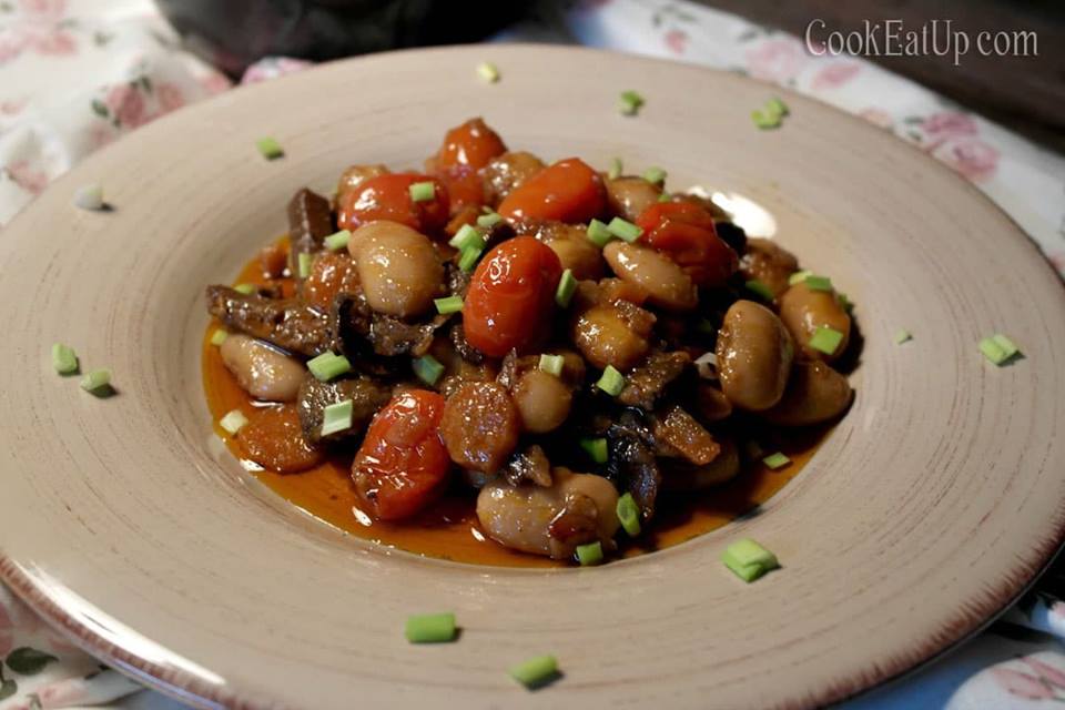 Μουλιάζουμε τους γίγαντες για τουλάχιστον 12 ώρες σε νερό με μισό κουταλάκι σόδα. Τους ξεπλένουμε καλά και τους κλείνουμε στη χύτρα για 7 λεπτά από το σφύριγμα. Σε ένα βαθύ τηγάνι θα σοτάρουμε όλα τα λαχανικά μαζί πασπαλίζουμε τη ζάχαρη και θα προσθέσουμε στο τέλος την ντομάτα, τα μπαχαρικά και αλατίζουμε κατά βούληση, αφήνουμε να βράσει για περίπου 10 λεπτά.