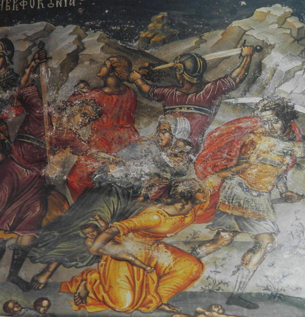Λεπτομέρεια από τη Σφαγή των Νηπίων – Ιερά Μονή Σταυρονικήτα, Τοιχογραφία Θεοφάνους από το Καθολικό, 16ος αι. μ.Χ.