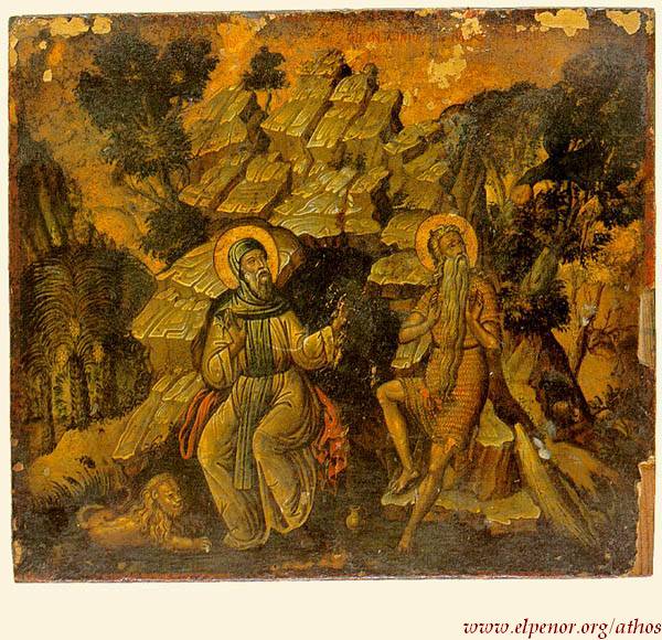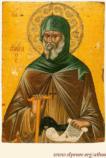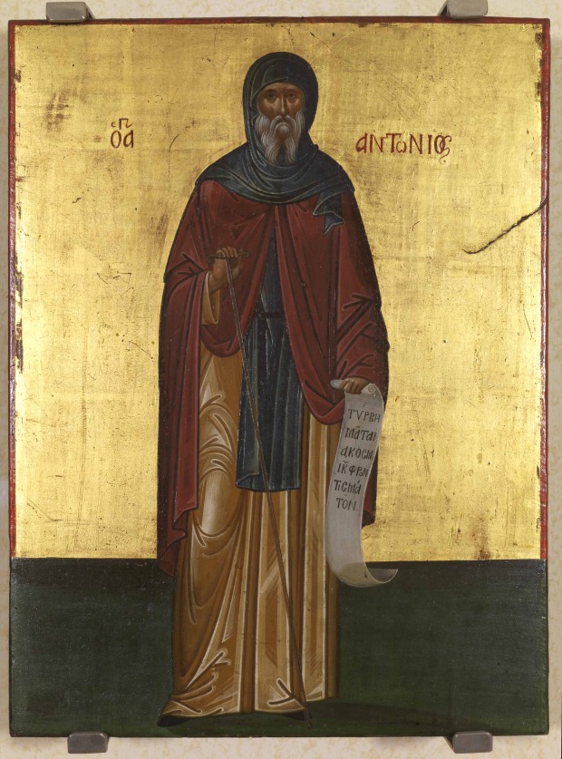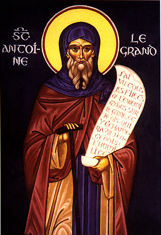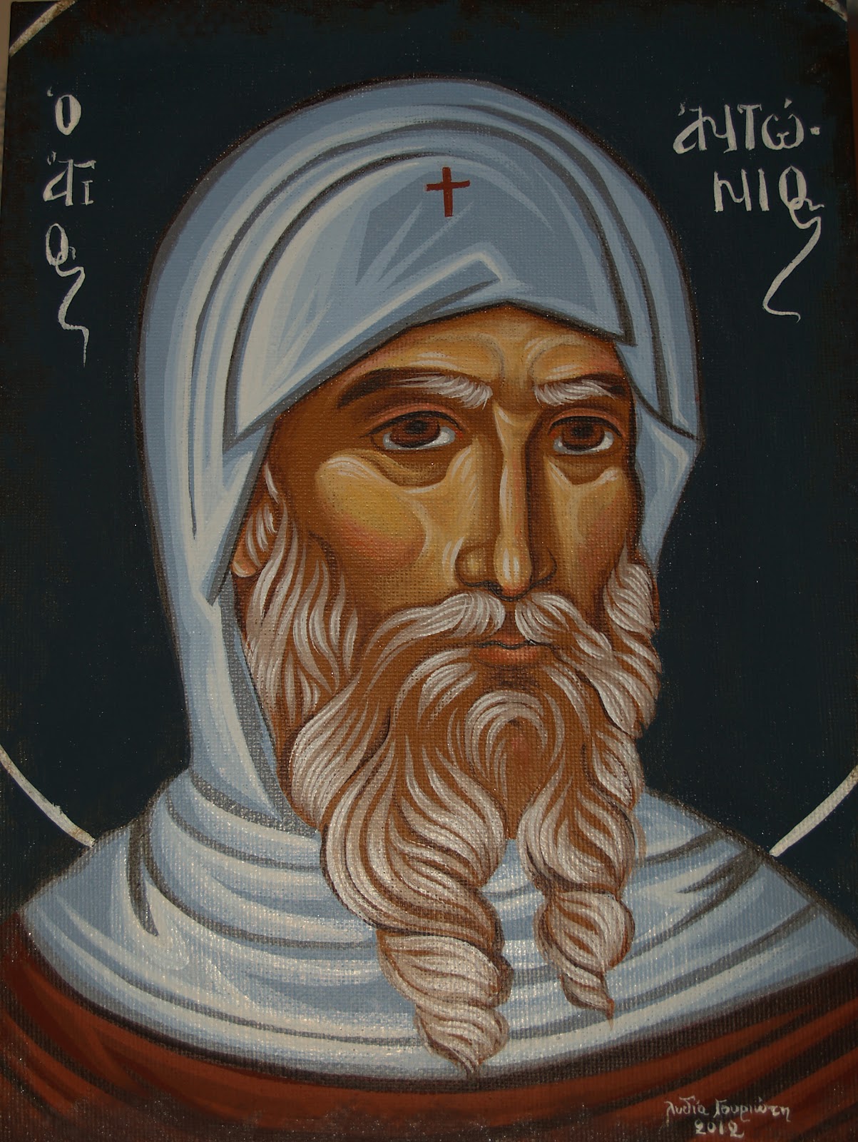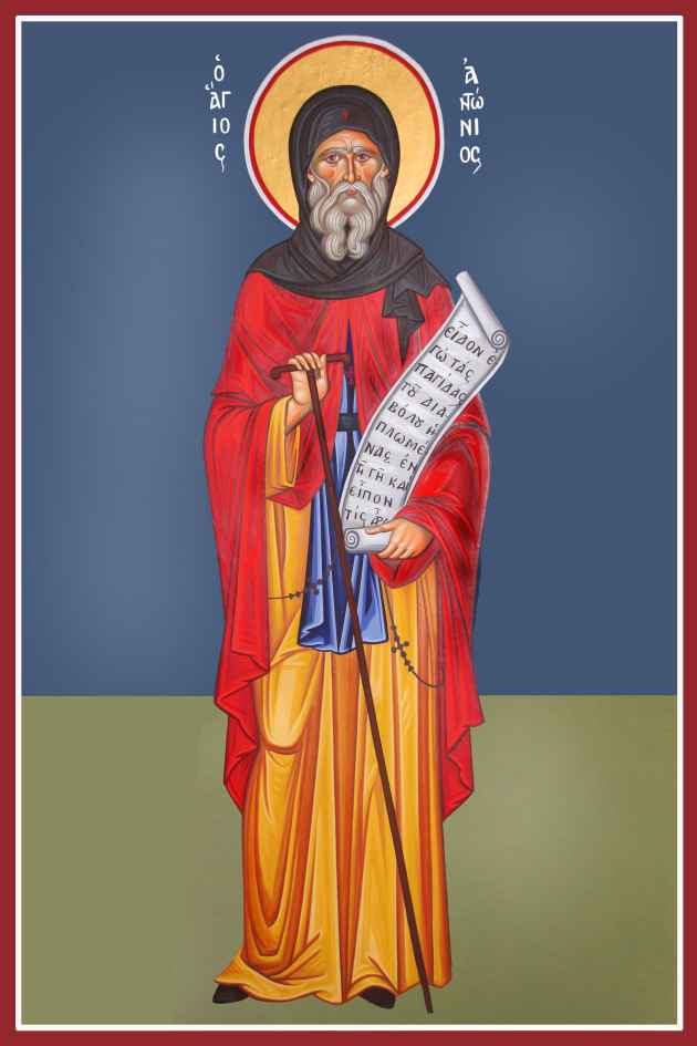 Τόν ζηλωτήν Ἠλίαν τοῖς τρόποις μιμούμενος, τῷ Βαπτιστῇ εὐθείαις ταῖς τρίβοις ἑπόμενος, Πάτερ Ἀντώνιε, τῆς ἐρήμου γέγονας οἰκιστής, καί τήν οἰκουμένην ἐστήριξας εὐχαῖς σου· διό πρέσβευε Χριστῷ τῷ Θεῷ, σωθῆναι τάς ψυχάς ἡμῶν.