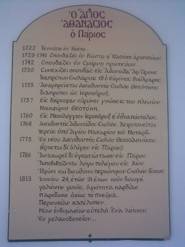 Ο Όσιος Αθανάσιος ο Πάριος (το πραγματικό του επώνυμο ήταν Τούλιος αλλά από την πολλή αγάπη του προς τη γενέτειρα του, το αντικατέστησε με το Πάριος) ήταν ένας επιφανής θεολόγος και μέγας διδάσκαλος του Γένους, από τους πολυγραφότερους και σπουδαιότερους συγγραφείς της εποχής του. Γεννήθηκε στο Κώστο της Πάρου το 1722 μ.Χ. Ο πατέρας του Απόστολος καταγόταν από την Καταβατή Σίφνου, που και σήμερα ζουν εκεί Τούλιοι η Τόληδες. Η μητέρα του ήταν Παριανή, από το αρχοντικό γένος Δαμία.