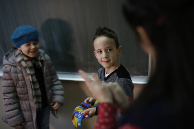 In this photo taken Thursday, Feb. 4, 2016, Bosnian boy Zejd Coralic, center, learns sign language from teacher Anisa Setkic-Sendic, not shown, with other children in a class at an elementary school in Sarajevo, Bosnia. In 2003, Bosnia adopted laws that allow children with disabilities to be fully integrated into society, including schools. Children with special needs are supposed to have professional assistants who sit with them in class, translating or otherwise helping them participate. But in practice, impoverished Bosnia barely has enough money to keep normal schools functioning and children with disabilities are left to the care and imagination of their parents and the good will of school staff. (AP Photo/Amel Emric)